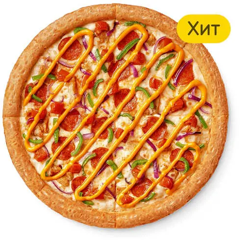 Цыпленок, острые колбаски чоризо, соус бургер, сладкий перец, красный лук, томаты, моцарелла, соус ранч, чеснок