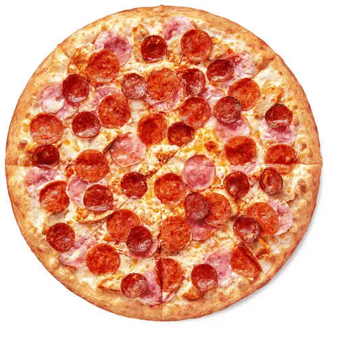 Цыпленок, ветчина, пикантная пепперони, острые колбаски чоризо, моцарелла, фирменный томатный соус