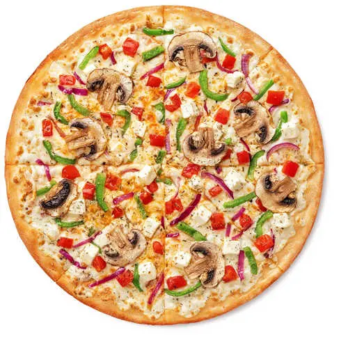Шампиньоны, томаты, сладкий перец, красный лук, кубики брынзы, моцарелла, фирменный томатный соус, итальянские травы