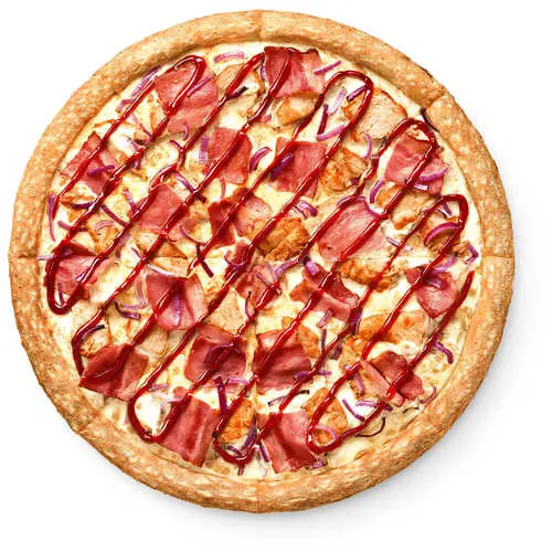 Цыпленок, бекон, соус барбекю, красный лук, моцарелла, фирменный томатный соус
